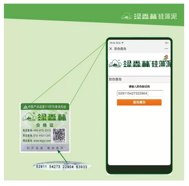 2.認(rèn)準(zhǔn)包裝:每一個正品綠森林硅藻泥的包裝上均有防偽查詢系統(tǒng)。消費(fèi)者可掃描對應(yīng)的二維碼,然后輸入涂層下方的防偽碼,即可查驗(yàn)產(chǎn)品真?zhèn)巍?/span>